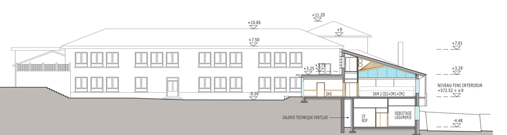 La préparation est aménagée en partie basse, directement accessible depuis la rue. Les enfant accèdent quant à eux au niveau restauration de plein pied depuis la cour. Le bâtiment permet l’accessibilité PMR aux étages de l’école, par une circulation présente dans le rampant.